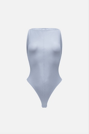 Боди из итальянской ткани в серебряном цвете, без рукавов, с вырезом лодочкой.