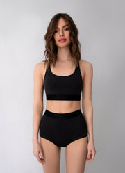 Купальник состоит из спортивного топа и трусиков с высокой талией.