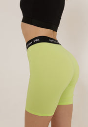 Летняя модель укороченных велосипедок из эластичной утягивающей ткани салатового цвета. Мягкая и эластичная резинка с логотипом бренда.